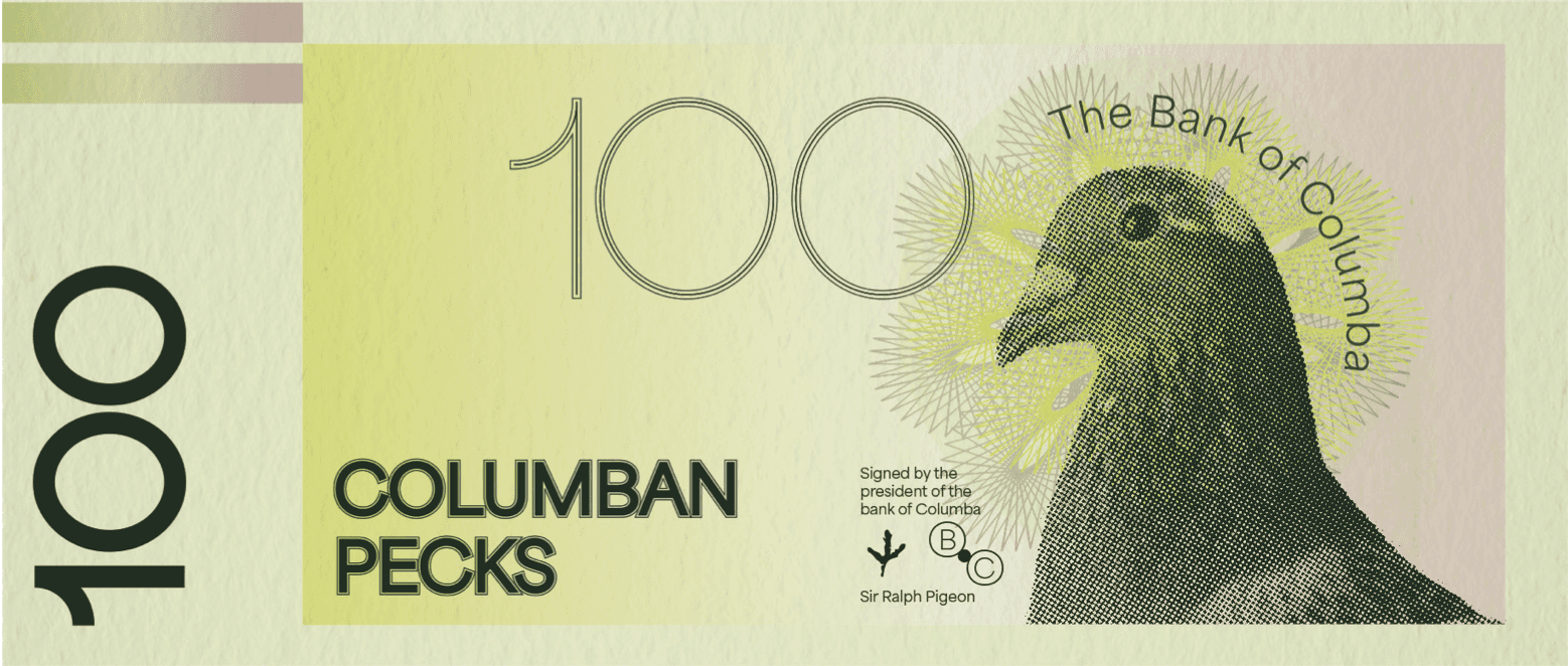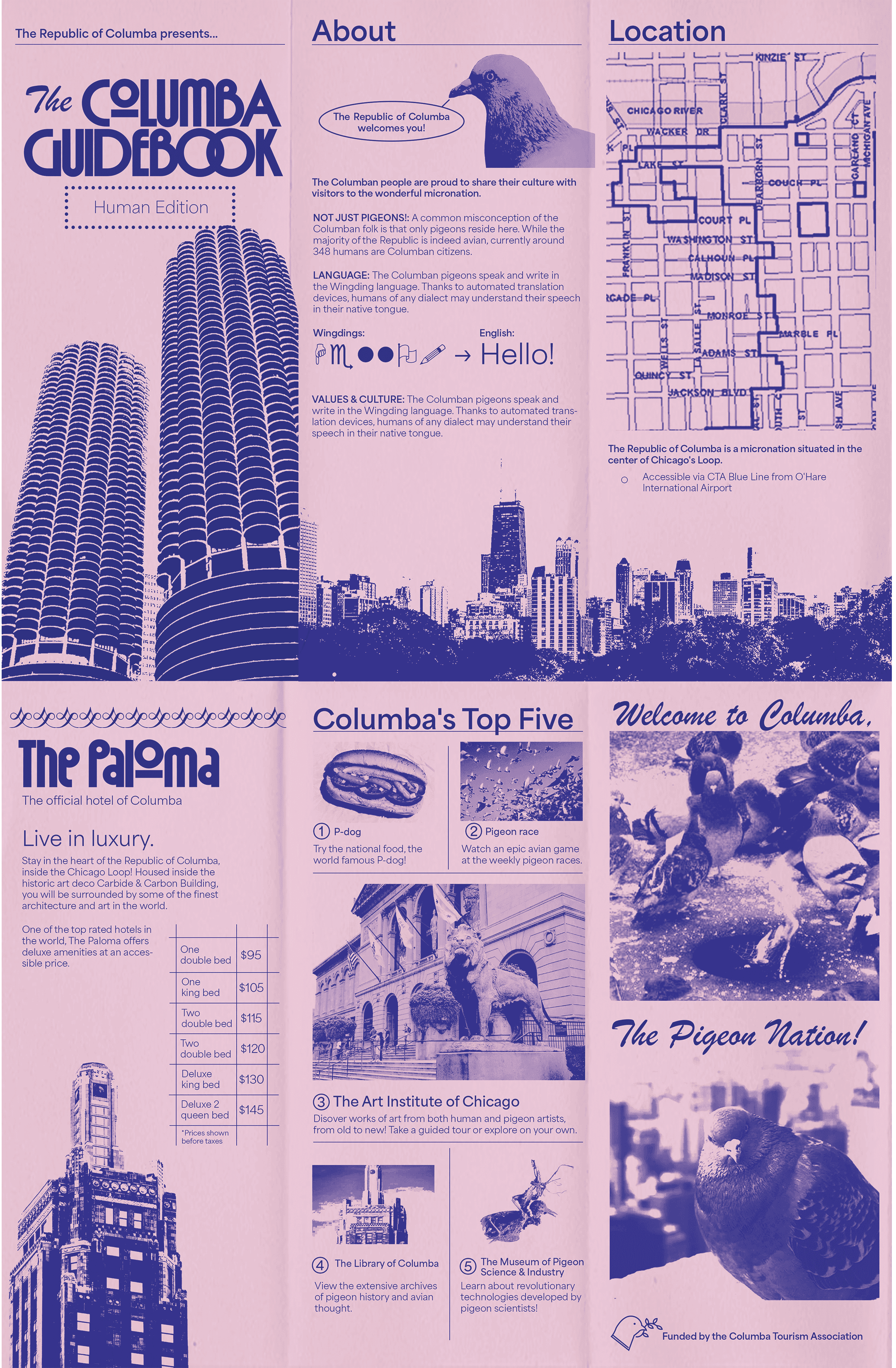 Visual identity for a conceptual pigeon human peaceful micronation located in Chicago. Established a history (available upon request) and designed currency, a flag, passport, and tourism materials for the micronation.
