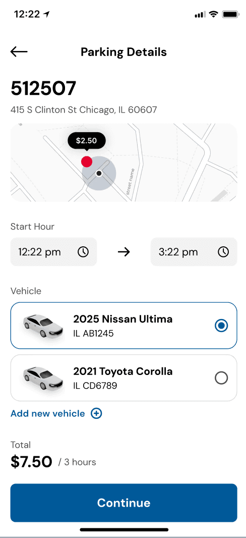 Parking in Chicago can be stressful, costly, and confusing, exacerbating already negative perceptions of city privatized parking. We saw opportunities in the Park Chicago app to alleviate stress that comes from this experience. How can we better support users' financial needs and use design to signify a move towards a more equitable future for parking?